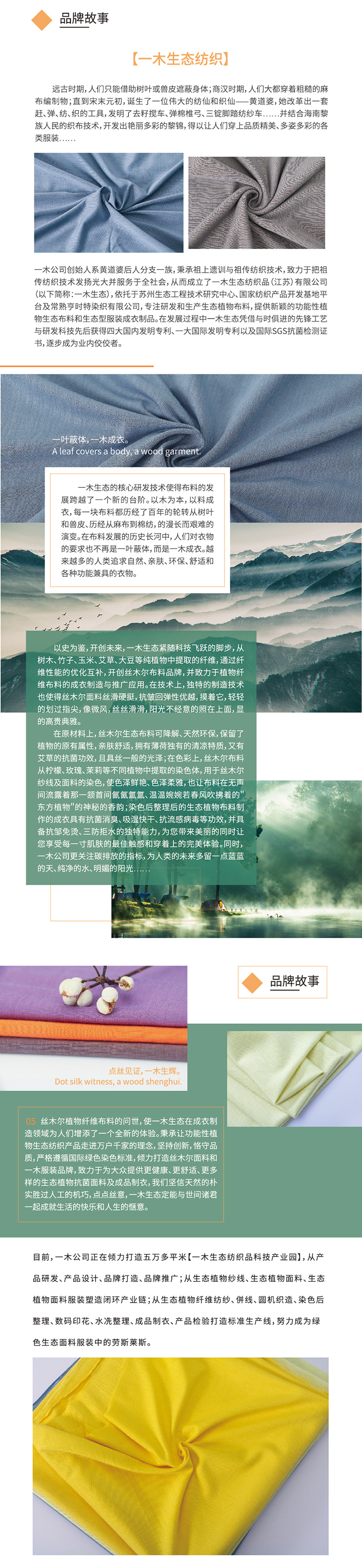 一木生态纺织产品应时代需求以及人们对天然环保服装的渴求而诞生公司以苏州生态工程技术研究中心为基地以一木生态纺织品科技产业园为依托,以研发、生产、销售(电子商务平台及跨境电商)新型功能性生态纺织产品为己任,产品全部采用天丝、莫代尔、竹纤维、玉米纤维、玫瑰、薄荷等新型纤维素纤维(植物纤维)。创新之道,本在惠人,一木人将永远秉承历史宝贵经验,在新的时代与君开创新的纪元。
